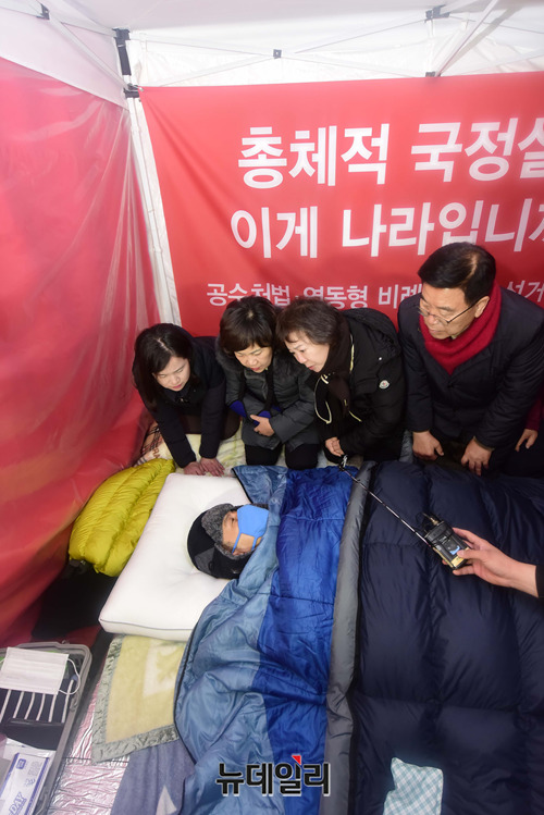 자유한국당 최고위원과 지도부가 26일 오후 9시께 청와대 사랑재 앞에 설치된 황교안 대표 단식현장을 방문해 단식중단을 설득하고 있다. 황 대표는 말을 하지 못하고 지도부의 말을 듣기만 했다. (왼쪽부터 신보라 최고, 김순례 최고, 정미경 최고, 김광림 최고, 박맹우 사무총장, 추경호 의원.)