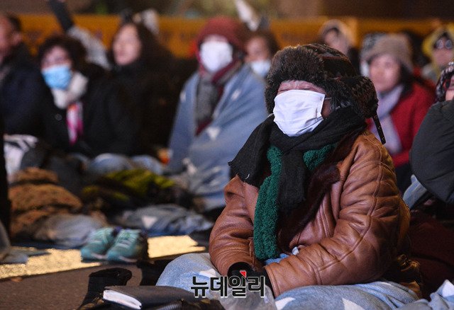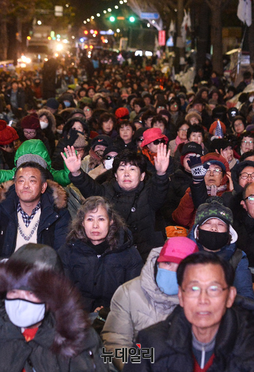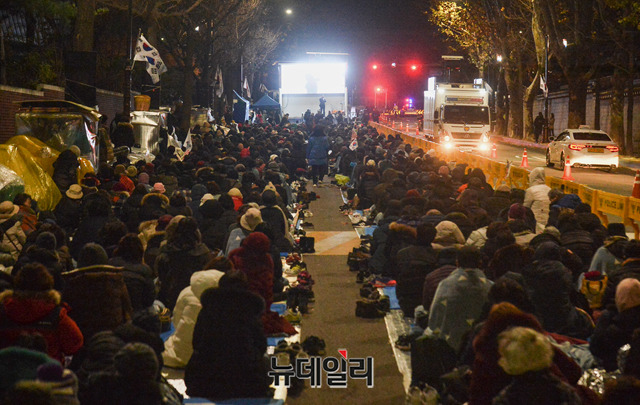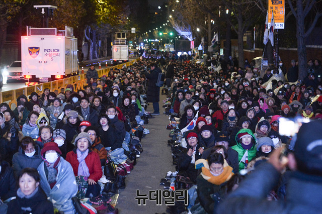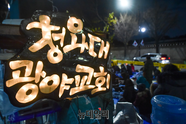 '문재인 퇴진'을 요구하며 55일째 철야농성을 하는 시민들이 26일 오후 청와대 앞 효자로에서 야간 예배를 이어가고 있다. 이날 야간 예배는 인근 주민들의 소음 피해를 고려해 마이크를 사용하지 않고 조용히 진행됐다.집회 관계자에 따르면 "종로경찰서와 협의하에 야간에는 주민들에게 피해를 주지 않게 조용히 예배를 한다"며 "야간집회에 참석한 3천여 명은 한 마음으로 조용한 예배에 동참했다"고 말했다.경찰은 지난 25일, 오후 6시부터 다음날 오전 9시까지 집회를 불허한다고 통보하고 경찰병력을 늘렸다. 주최측은 집회시 허용범위 내의 데시벨까지 볼륨을 줄이고, 오후 6시 이후에는 스피커 사용을 중단하고 있다.