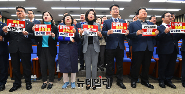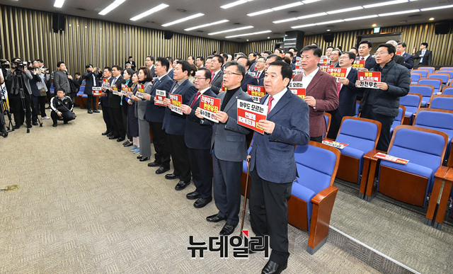 나경원 자유한국당 원내대표 등 소속 의원들이 27일 오전 국회에서 열린 의원총회에서 '패스트트랙 원천무효-공수처법 반대' 손피켓을 듣고 구호를 외치고 있다.