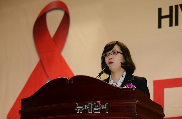 김지연 한국가족보건협회 대표가 27일 오후 국회 의원회관에서 열린 한국가족보건협회, 윤종필 자유한국당 의원 주관 세계 에이즈의 날 기념 세미나 '디셈버퍼스트'에 참석해 환영사를 하고 있다.