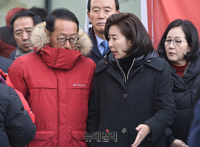 나경원 자유한국당 원내대표와 김도읍 의원이 27일 오전 청와대 사랑채에서 8일째 단식투쟁인 황교안 자유한국당 대표를 위로 방문하고 대화를 나누고 있다.