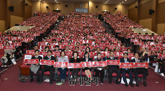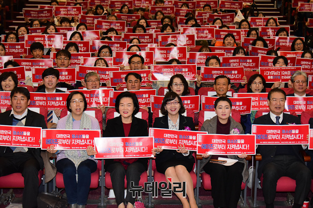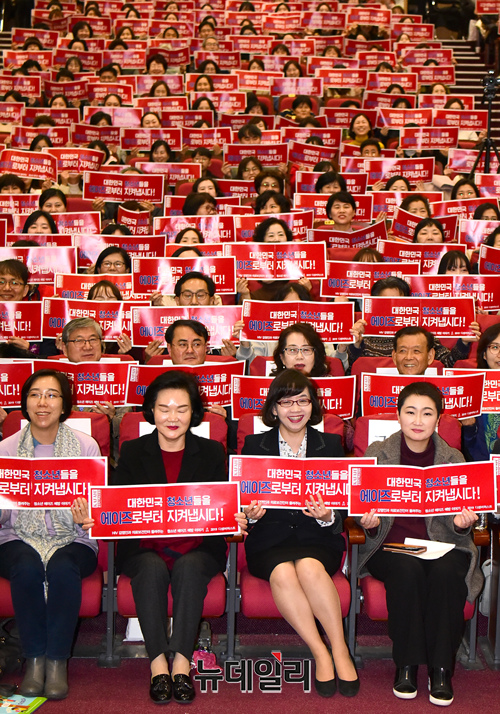 김지연 한국가족보건협회 대표, 윤종필 자유한국당 의원, 이언주 무소속 의원 등 참석자들이 27일 오후 국회 의원회관에서 열린 한국가족보건협회 주관 세계 에이즈의 날 기념 세미나 '디셈버퍼스트'에 참석해 청소년 에이즈 예방 퍼포먼스를 하고 있다.