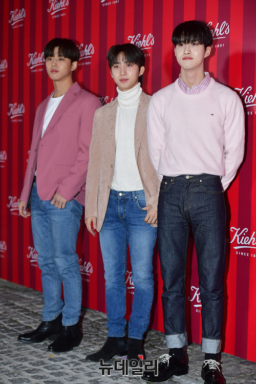 펜타곤 홍석(왼쪽부터), 후이, 여원이 27일 오후 서울 강남구 프로젝트910에서 열린 코스메틱 브랜드 키엘 2019 홀리데이 에디션 출시행사에서 포토타임을 갖고 있다.