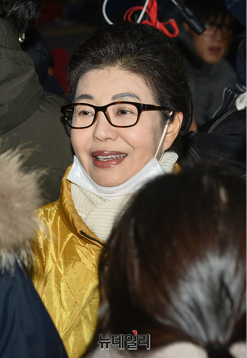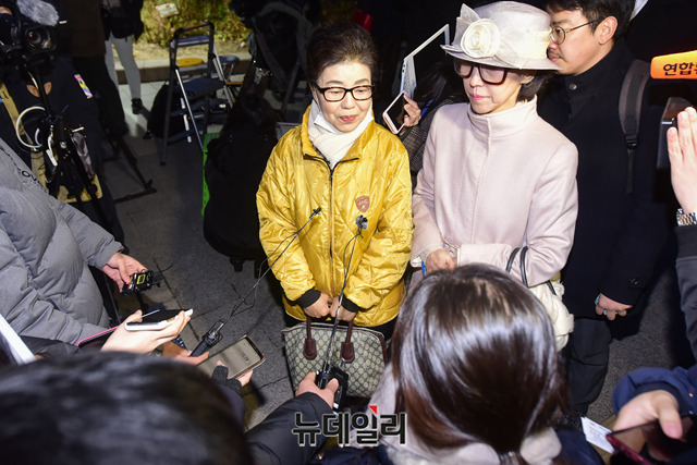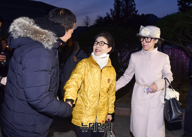 박근령 전 육영재단 이사장이 27일 오후 청와대 사랑채 앞에서 8일째 단식투쟁 중인 황교안 자유한국당 대표의 단식천막을 방문하고 있다.
