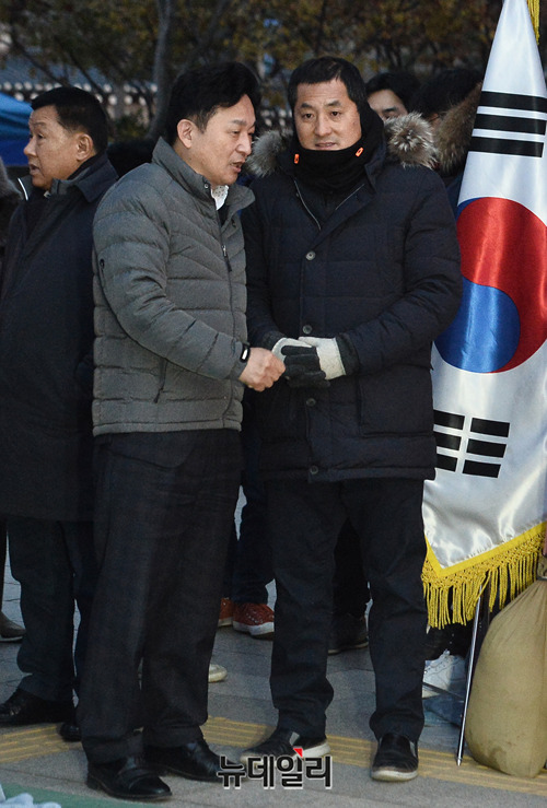 원희룡 제주지사와 박대출 자유한국당 의원이 27일 오후 청와대 사랑채 앞에서 대화를 나누고 있다.