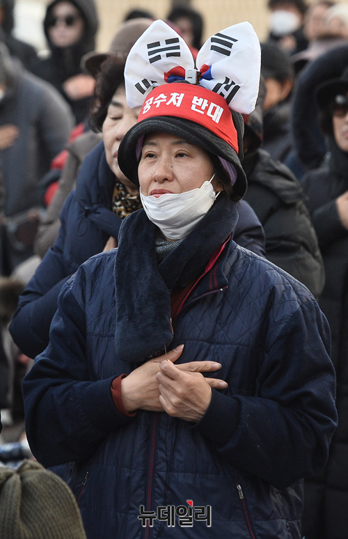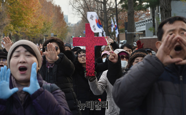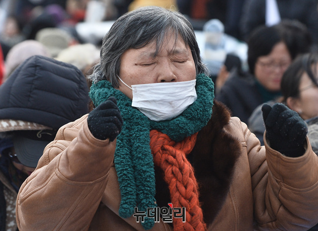 '문재인 퇴진'을 요구하며 56일째 철야농성 중인 시민들이 27일 오후 청와대 앞 효자로에서 열린 예배에서 황교안 자유한국당 대표를 위해 기도하고 있다.