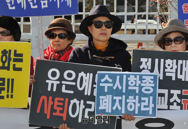 공정사회를위한국민모임이 28일 오후 서울 종로구 정부서울청사 앞에서 '정시 40% 확대 총선용 혼란 주범 유은혜 사퇴하라' 기자회견을 열고 구호를 외치고 있다.이들은 성명서를 통해 "정부의 정시확대 방향은 옳았으나 40% 확대는 불공정한 대입제도에 분노한 국민들이 원했던 답이 아니다"라며 "40%로 정한 것은 대입제도의 공정성 제고 보다 납득할 근거 없이 어중간하게 절충한 총선용 정시확대"라고 말했다.