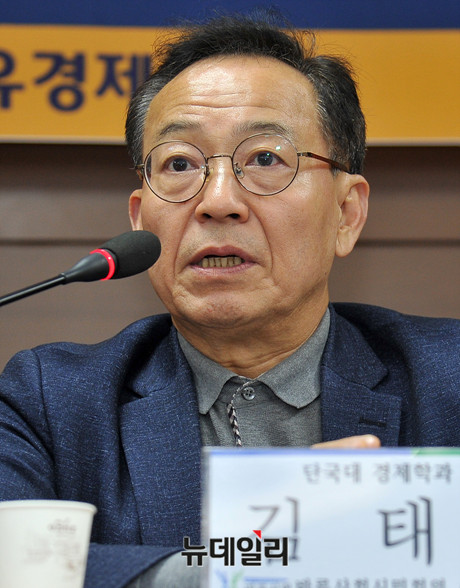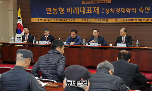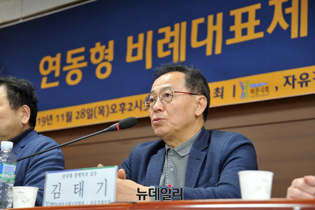 김태기 단국대 경제학과 교수가 28일 오후 서울 중구 서울시의회 의원회관에서 열린 '연동형 비례대표제: 정치경제학적 측면' 토론회에서 '연동형 비례대표제의 의도와 결말' 주제로 발표하고 있다.바른사회시민회의와 자유경제포럼이 공동주최한 이날 토론회는 현진권 자유경제포럼 대표의 사회로 김태기 단국대 경제학과 교수, 양준모 연세대 경제학과 교수가 발제를 맡았다. 이어진 토론에는 김인영 한림대 정치행정학과 교수, 박인환 전 건국대 법학전문대학원 교수가 참석했다.