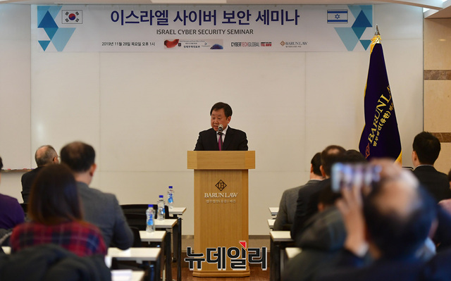 박철 법무법인 바른 대표가 28일 오후 서울 강남구 법무법인 바른 대강당에서 열린 '이스라엘 사이버 보안 세미나'에서 인사말을 하고 있다.