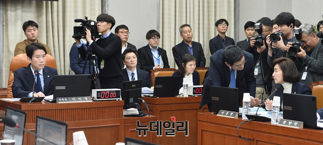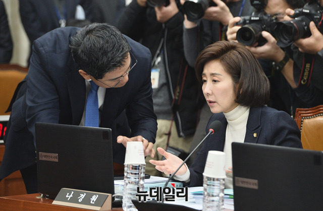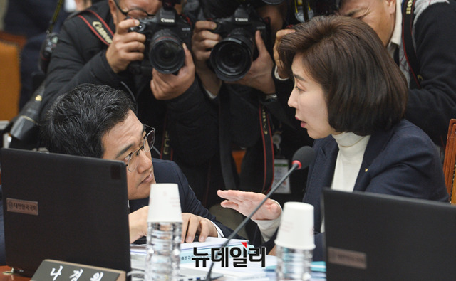 나경원 자유한국당 원내대표와 오신환 바른미래당 원내대표가 28일 오후 국회에서 열린 국회 운영위원회 전체회의에서 대화를 하고 있다.