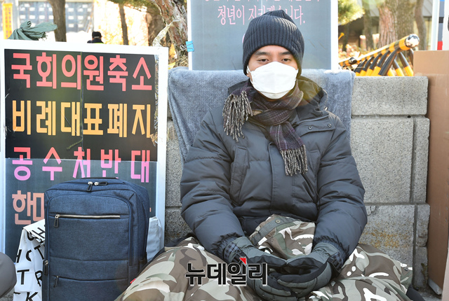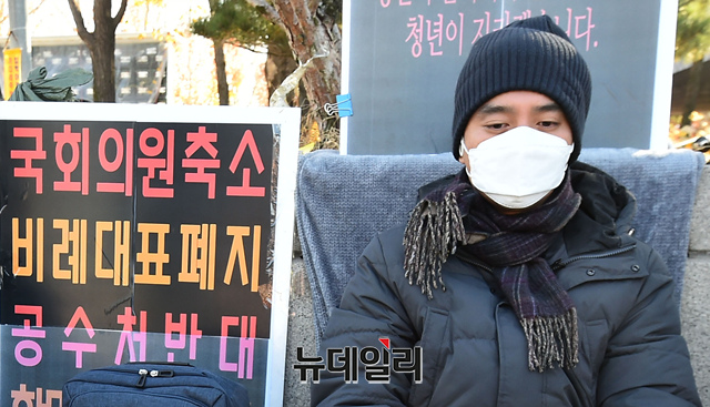 박결 자유의새벽당 대표가 28일 청와대 앞 분수대 광장 인근에 '국회의원 축소, 비례대표 폐지, 공수처 반대' 등을 주장하며 닷새째 단식을 이어가고 있다. 자유의새벽당은 지난 7월 창당한 청년 우파 정당이다.