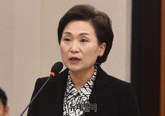 김현미 국토교통부 장관이 28일 오후 국회에서 열린 국토교통위원회 전체회의에 참석해 업무보고를 하고 있다. 이날 국토위에서는 '주차장법 일부개정법률안(하준이법)'을 의결했다.