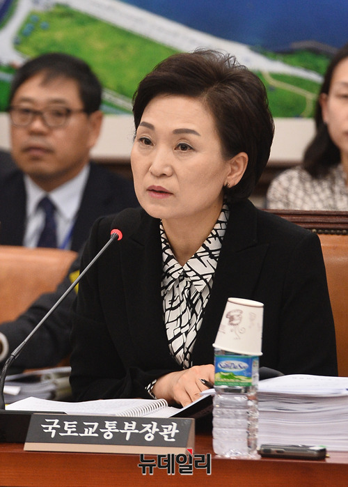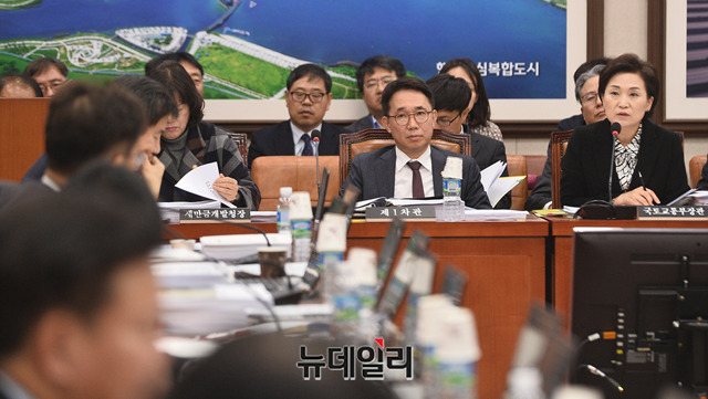 김현미 국토부 장관이 28일 오후 국회에서 열린 국토교통위원회 전체회의에 참석해 의원들의 질의에 답하고 있다. 이날 국토위에서는 '주차장법 일부개정법률안(하준이법)'을 의결했다.