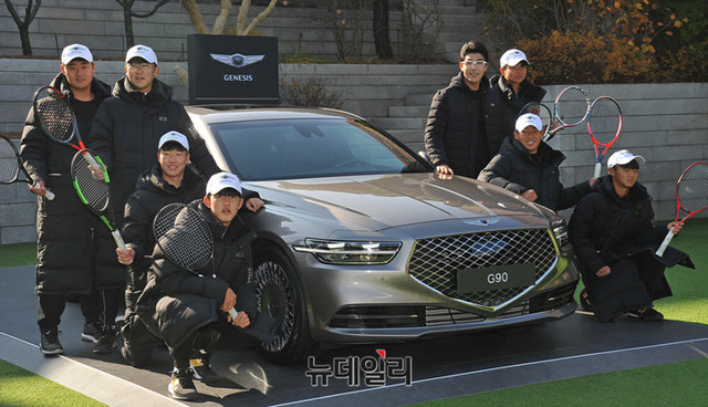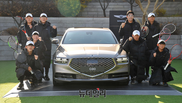 테니스 선수 정현이 모교인 삼일공고 후배 선수들과 29일 오전 서울 중구 신라호텔 영빈관에서 열린 '제네시스와 함께하는 정현 선수와의 만남 2019'에서 차량 G90과 함께 포토타임을 갖고 있다. 이날 제네시스는 2018년부터 정현 선수를 후원한 이래 2년차를 맞아 국내 테니스 팬 및 주니어 테니스 선수와의 팬미팅을 개최했다.