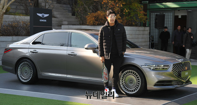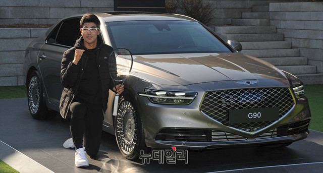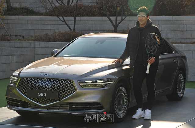 테니스 선수 정현이 29일 오전 서울 중구 신라호텔 영빈관에서 열린 '제네시스와 함께하는 정현 선수와의 만남 2019'에서 차량 G90과 함께 포토타임을 갖고 있다. 이날 제네시스는 2018년부터 정현 선수를 후원한 이래 2년차를 맞아 국내 테니스 팬 및 주니어 테니스 선수와의 팬미팅을 개최했다.