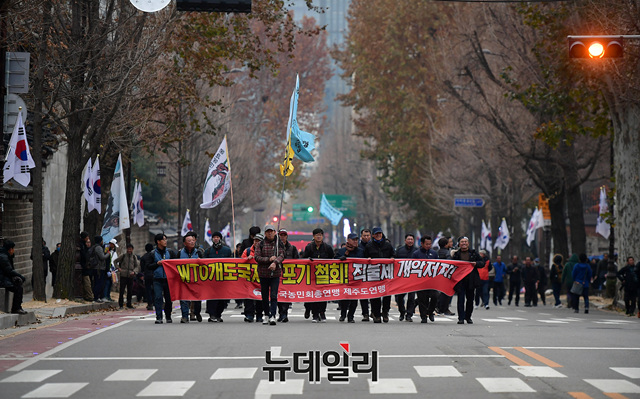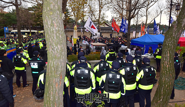 민노총, 전농을 비롯한 민중공동행동이 30일 오후 광화문 광장에서 본집회를 마치고 청와대 앞 효자로까지 가두행진 후 집결해 있다.