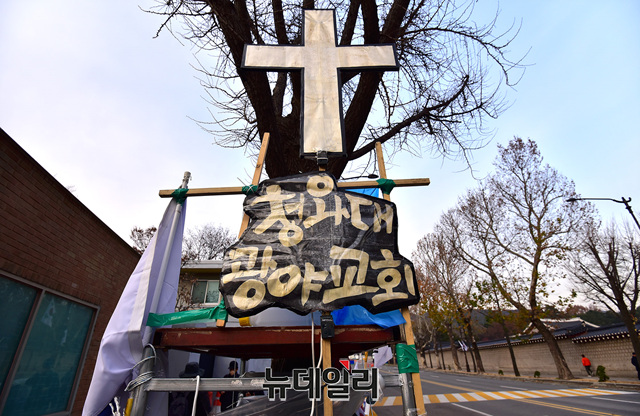이곳은 문재인 퇴진을 주장하며 한기총 등 기독교인들이 59일째 철야농성을 하는 곳이다. 민노총 가두행진에 앞서 철야농성장은 잠시 비워졌다. 경찰은 펜스를 설치하고 충돌에 대비했다.