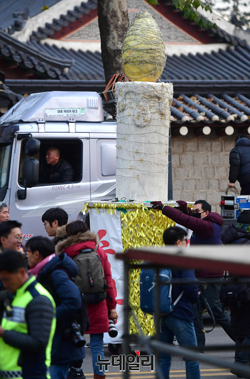 [포토] 대형촛불 앞세워 청와대 앞에 집결한 민노총