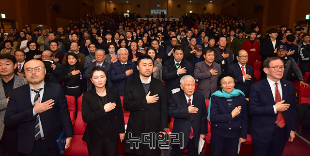 '미래를 향한 전진 4.0(가칭)' 창당 발기인 대회 참가자들이 1일 오후 국회 의원회관 대강당에서 열린 발기인대회에 앞서 국민의례를 하고 있다.