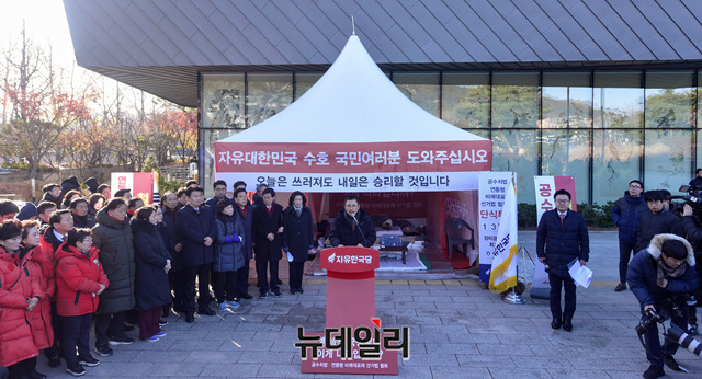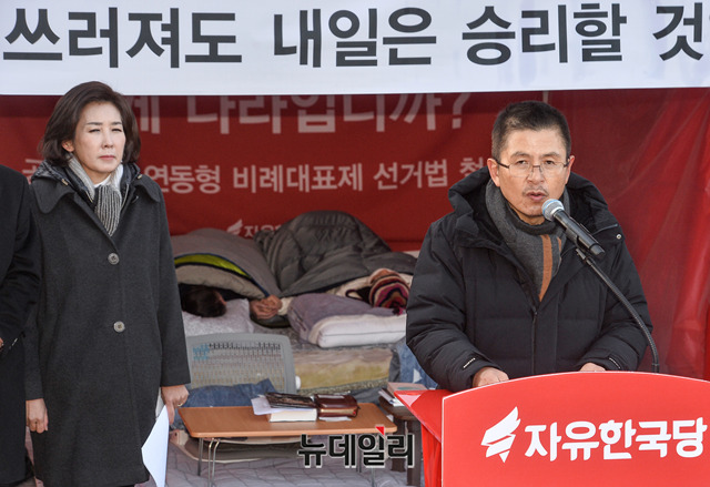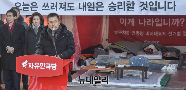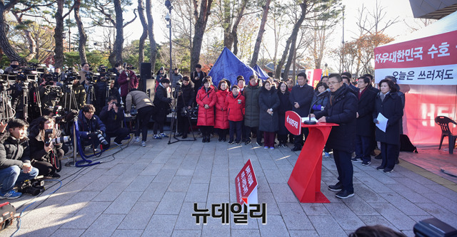 황교안 자유한국당 대표가 2일 오전 청와대 사랑채 앞에서 열린 최고위원회의에서 모두발언을 하고 있다.