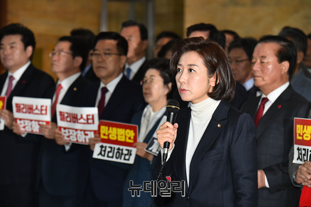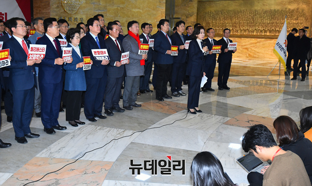 나경원 자유한국당 원내대표가 2일 오전 국회 로텐더홀에서 열린 '문희상 국회의장·민주당 본회의 봉쇄 규탄대회'에서 모두발언을 하고 있다.
