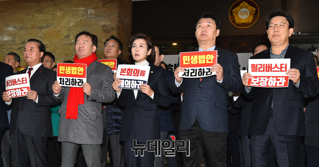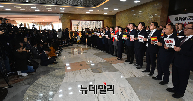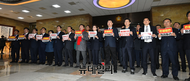 나경원 자유한국당 원내대표 등 소속의원들이 2일 오전 국회 로텐더홀에서 열린 '문희상 국회의장·민주당 본회의 봉쇄 규탄대회'에서 규탄구호를 외치고 있다.