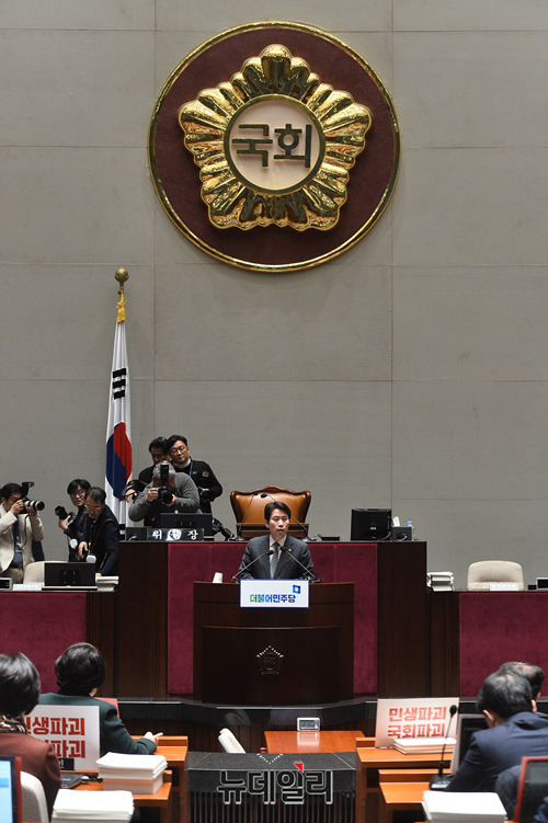 이인영 더불어민주당 원내대표가 2일 오후 국회에서 열린 의원총회에서 모두발언을 하고 있다.