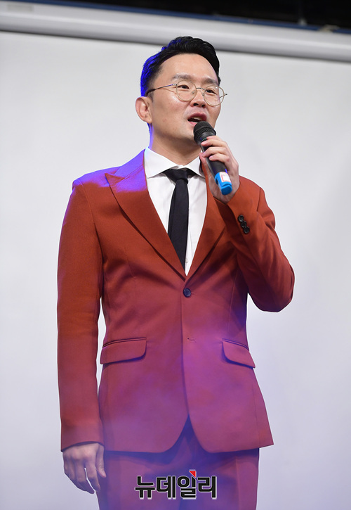 개그맨 윤형빈이 2일 오후 서울 마포구 윤형빈소극장에서 열린 '2019 윤형빈 개그쇼 프로젝트' 제작발표회에서 인사말을 하고 있다.