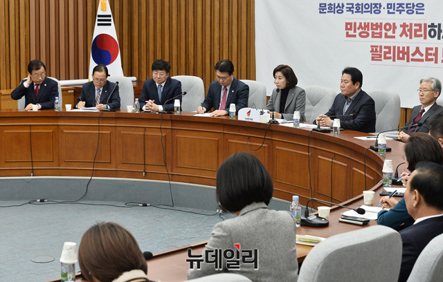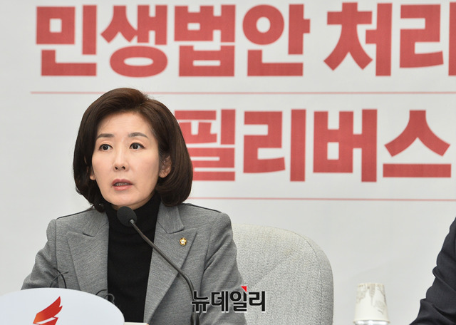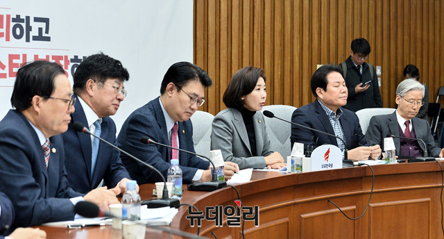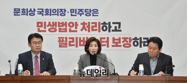 나경원 자유한국당 원내대표가 3일 오전 국회에서 열린 원내대책회의에서 모두발언을 하고 있다.