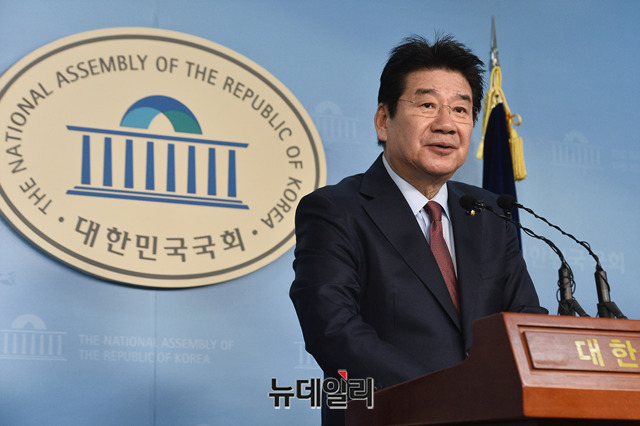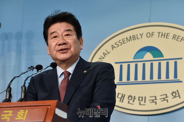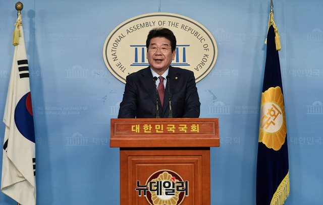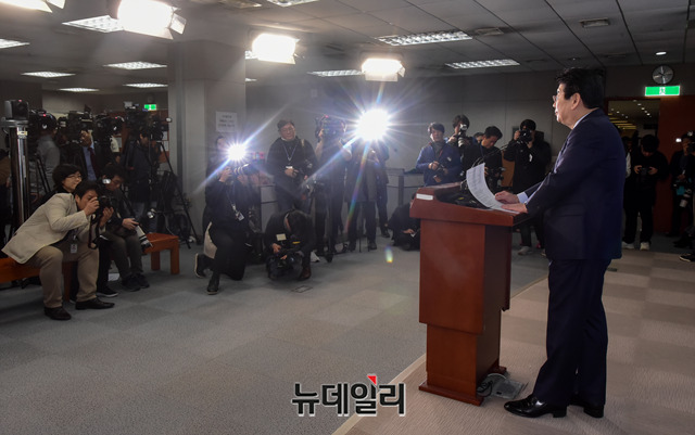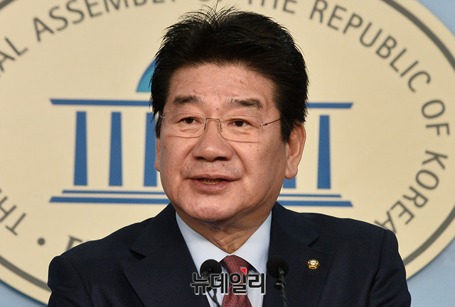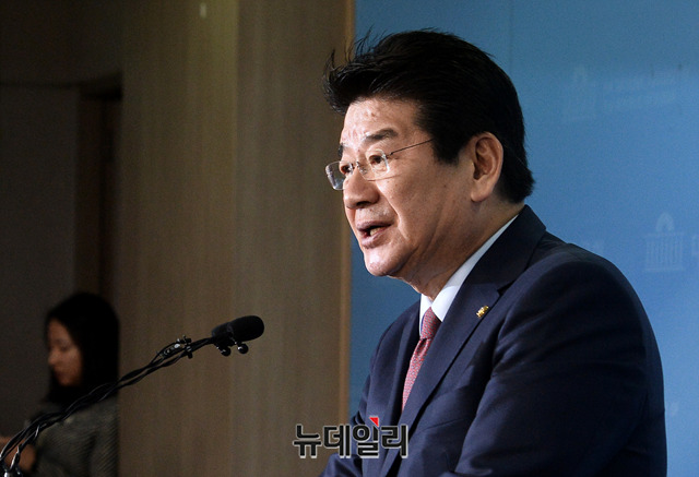 강석호 자유한국당 의원이 3일 오전 국회 정론관에서 원내대표 경선 출마 선언 기자회견을 갖고 있다.