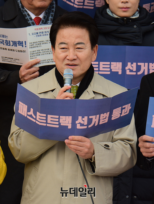 정동영 민주평화당 대표가 3일 오후 국회 본청 앞 계단에서 열린 '개혁 발목잡는 자유한국당 규탄 및 선거제도 개혁 완수 결의 기자회견'에 참석하여 모두발언을 하고 있다.