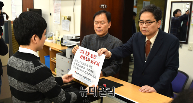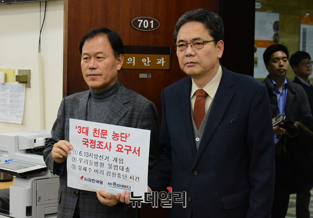 곽상도·윤한홍 자유한국당 의원이 3일 오후 국회 의안과에 '친문농단 게이트 국정조사 요구서'를 제출하고 있다.