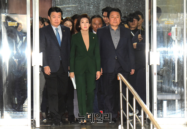 나경원 자유한국당 원내대표, 정용기 정책위의장, 정양석 원내수석부대표가 4일 오전 국회에서 열린 의원총회에 입장하고 있다.