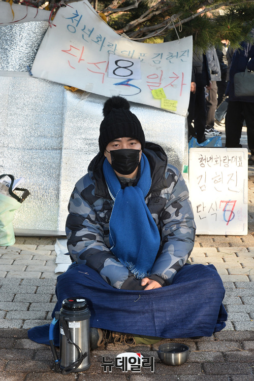 김 대표는 △최저임금 동결 △주유수당 폐지 △청년수당 폐지 등을 주장하며 단식을 이어가고 있다. 청년화랑은 지덕체를 겸비해 미래를 바꾸겠다는 청년들로 이루어진 우파 단체다.