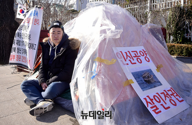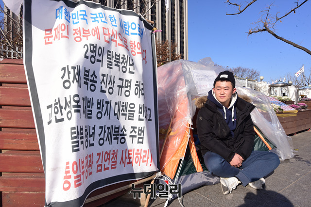 탈북청년 주일룡 고려대학교 트루스포럼 대표가 4일 오전 서울 종로구 정부서울청사 앞에서 2일째 김연철 통일부 장관의 사퇴를 촉구하며 단식을 이어가고 있다.주 대표는 "탈북민 한성옥 모자 아사 사건 재발 방지 대책을 반대하고, 탈북선원 2명의 강제북송 주범인 김 장관은 사퇴해야 한다"고 말했다. 이어 "대학 졸업 후 로스쿨에 진학해 탈북민들의 인권 향상을 위해 힘쓰고 싶다"며 비전을 말했다.주 대표의 단식은 탈북모자 사망사건 등으로 반발해 단식농성에 나섰던 탈북민 이동현(46)씨의 단식에 이은 것이다. 이동현 씨는 단식 9일째인 3일 오후 건강악화로 병원으로 이송됐다.주 대표는 2009년 탈북해 2016년 고려대학교에 재학중이다.