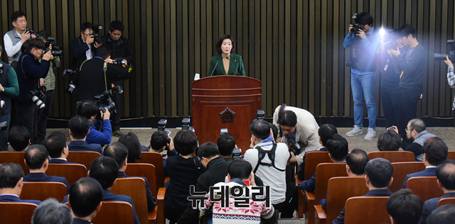 나경원 자유한국당 원내대표가 4일 오전 국회에서 열린 의원총회에 참석해 모두발언을 하고 있다.