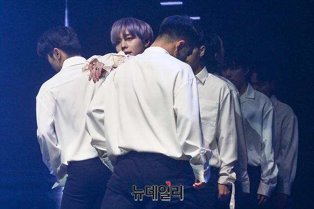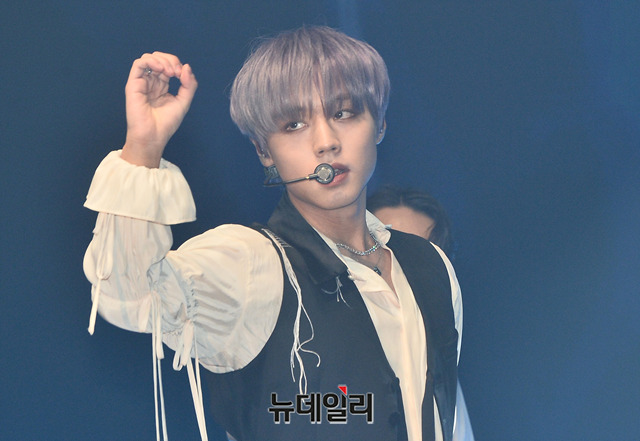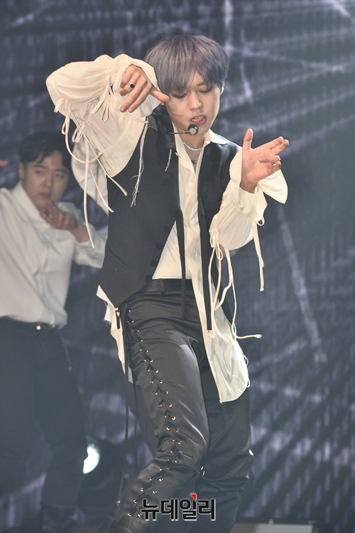 워너원 출신 가수 박지훈이 4일 오후 서울 서대문구 연세대학교 백주년기념관에서 열린 두 번째 미니앨범 '360' 쇼케이스에서 무대를 선보이고 있다.
