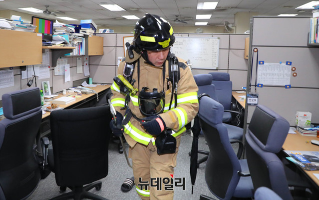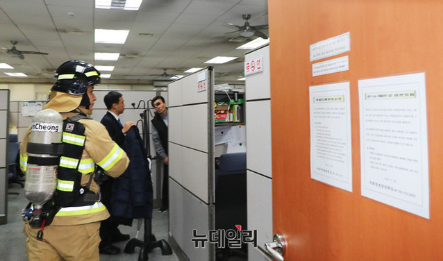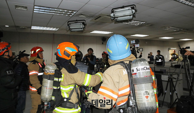 소방관들이 5일 오후 국회 정론관과 취재기자실에 화재 신고를 받고 출동해 발화점을 찾고 있다.