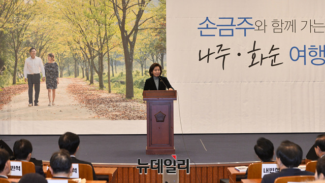 나경원 자유한국당 원내대표가 5일 오후 국회 헌정기념관에서 열린 손금주 더불어민주당 의원의 북콘서트에 참석해 축사를 하고 있다.