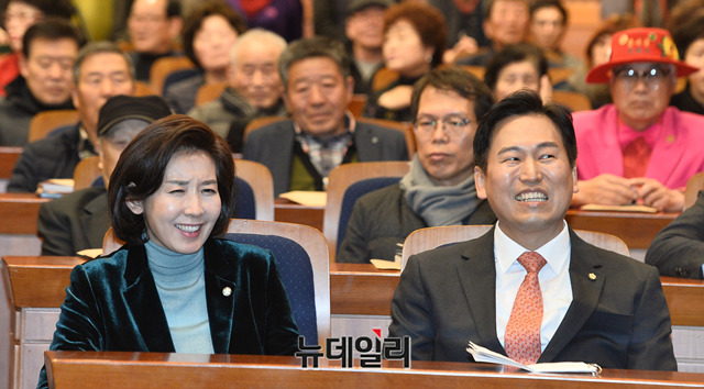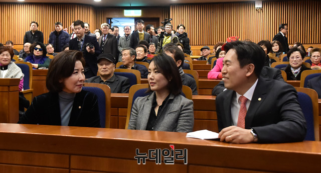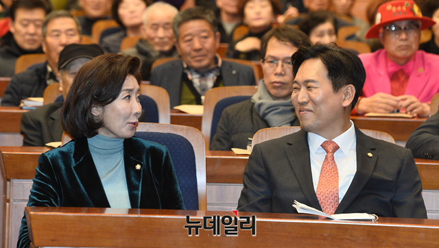 나경원 자유한국당 원내대표와 손금주 더불어민주당 의원이 5일 오후 국회 헌정기념관에서 열린 손 의원의 북콘서트에서 대화를 나누고 있다.