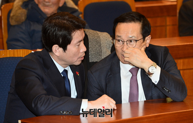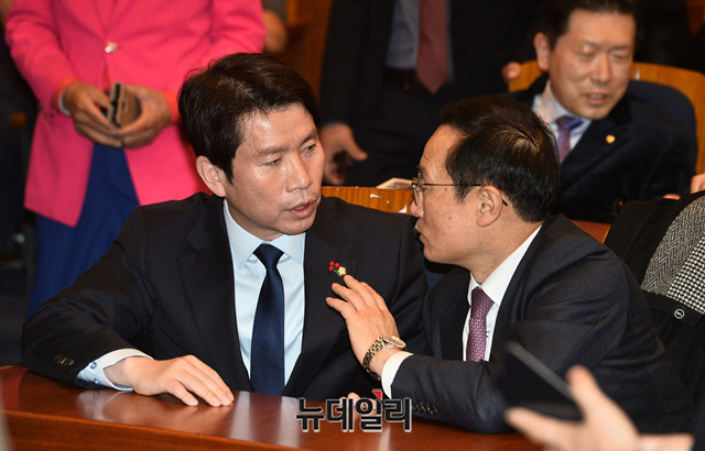 이인영 더불어민주당 원내대표와 홍영표 의원이 5일 오후 국회 헌정기념관에서 열린 손금주 의원의 북콘서트에 참석해 대화를 나누고 있다.