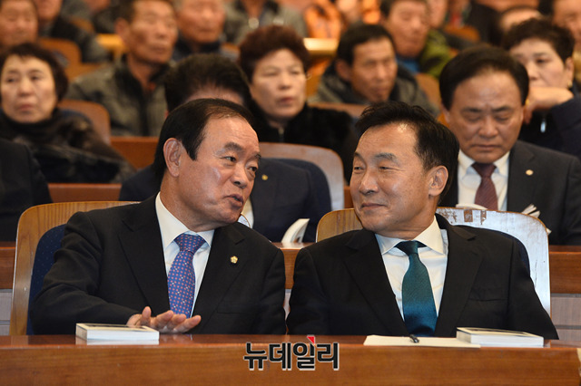 손학규 바른미래당 대표와 장병완 대안신당 의원이 5일 오후 국회 헌정기념관에서 열린 손금주 더불어민주당 의원의 북콘서트에 참석해 대화를 나누고 있다.