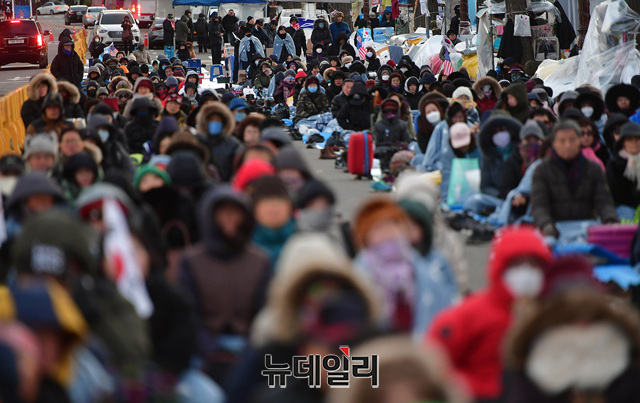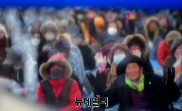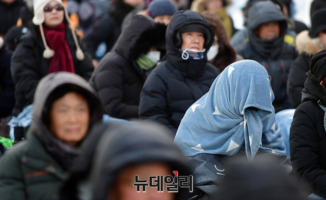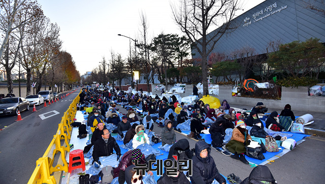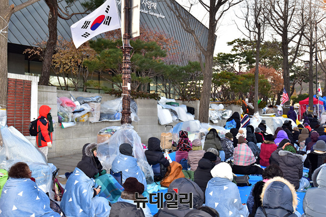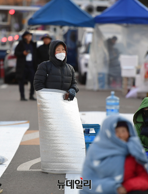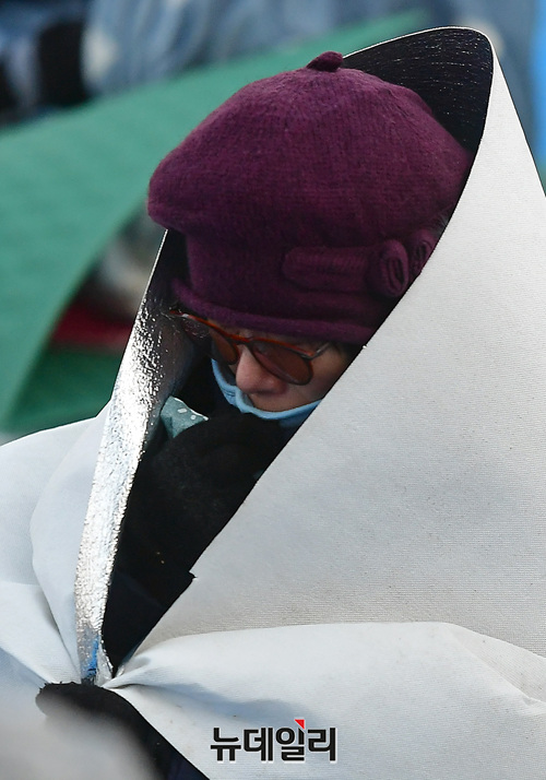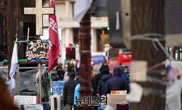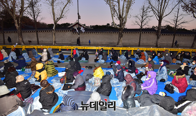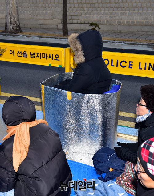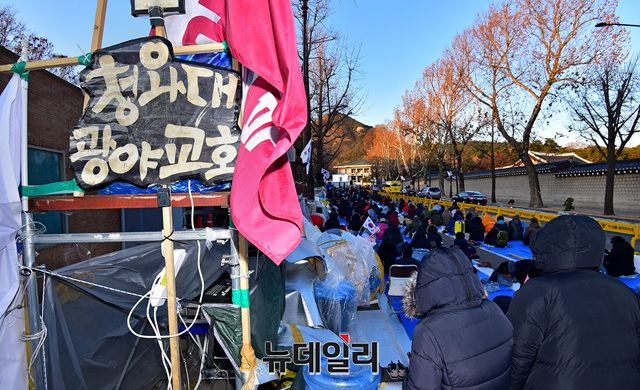 '문재인 퇴진'을 요구하는 시민들이 5일 오후 청와대 앞 효자로 철야농성을 이어가고 있다. 이들은 이곳을 '청와대 광야교회'로 지칭, 전국에서 교인들이 모여들고 있다.이날 오후 기온이 영하권으로 떨어졌지만 약 300여 명의 시민들이 방한 복장과 장비를 착용하고 예배와 기도를 이어가고 있다. 5일 밤 최저기온은 영하 7도, 체감온도는 영하 14도를 기록했다.주최측은 인근 학교와 주민들에게 피해를 최소화하기 위해 오후 6시 이후 마이크와 스피커 사용을 최소화하고, 통행에 불편함이 없게 인도를 확보하고 있다.인근 청와대 사랑채 앞에는 김현진 청년화랑 대표가 황교안 자유한국당 대표의 단식에 동조하며 10일째 단식을 이어가고 있다.