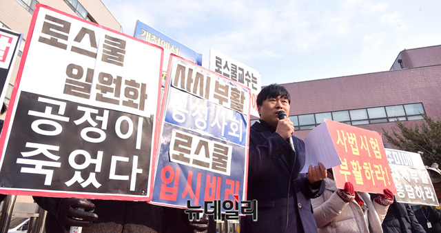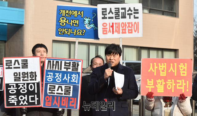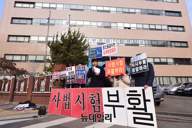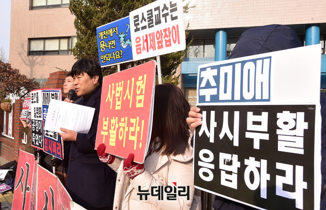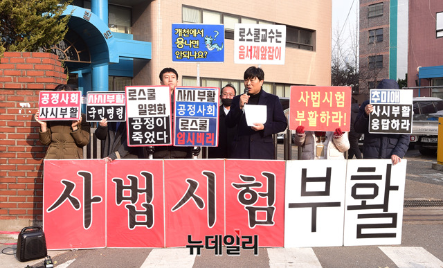 이종배 사법시험존치를위한고시생모임 대표 및 회원들이 9일 오전 서울 양천구 서울남부준법지원센터 앞에서 '추미애 법무부장관 후보자 로스쿨 우회로 도입' 촉구 기자회견을 갖고 있다.