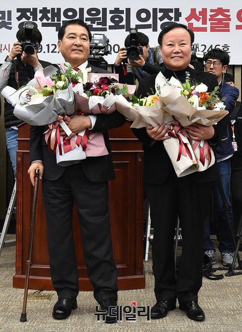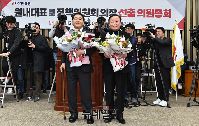 자유한국당 신임 원내대표에 선출된 심재철 의원과 신임 정책위의장에 선출된 김재원 의원이 9일 오전 국회에서 열린 의원총회에서 축하 꽃다발을 받고 기뻐하고 있다.