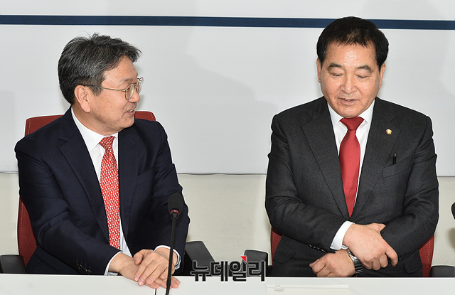 심재철 자유한국당 신임 원내대표가 9일 오후 국회 원내대표실에서 강기정 청와대 정무수석의 예방을 받고 대화를 나누고 있다.