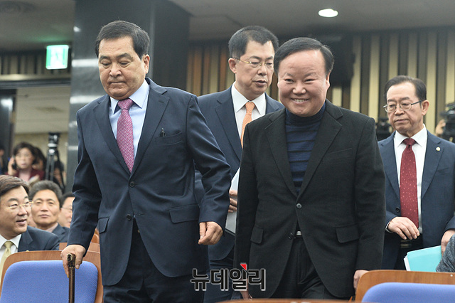심재철 자유한국당 원내대표, 김재원 정책위의장 및 지도부가 10일 오전 국회에서 열린 의원총회에 입장하고 있다.