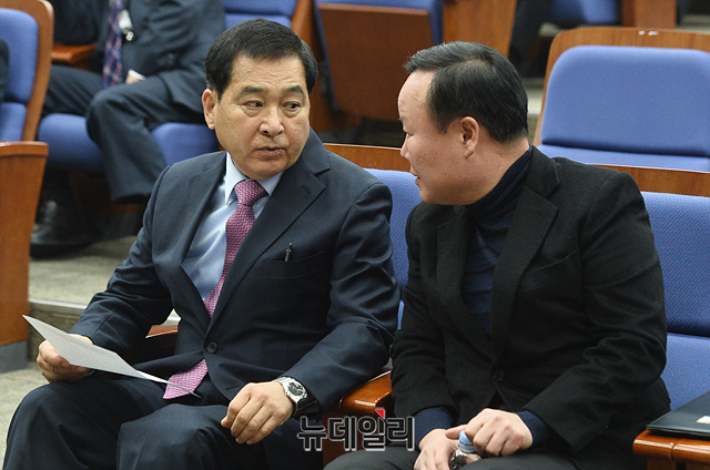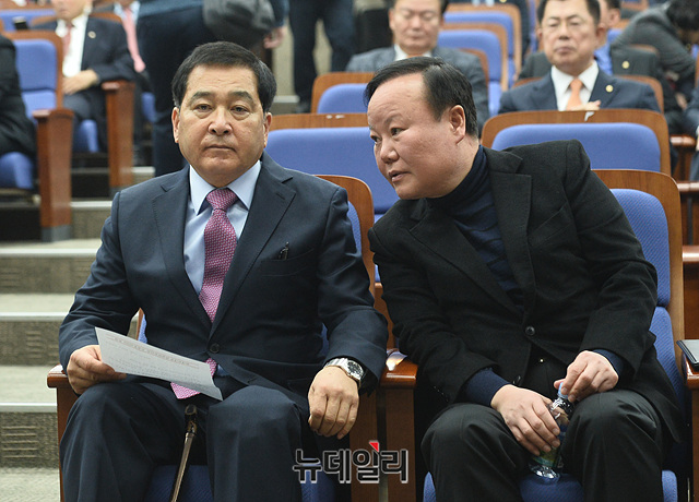 심재철 자유한국당 원내대표와 김재원 정책위의장이 10일 오전 국회에서 열린 의원총회에 참석해 대화를 나누고 있다.