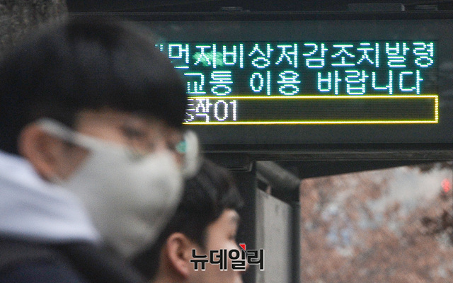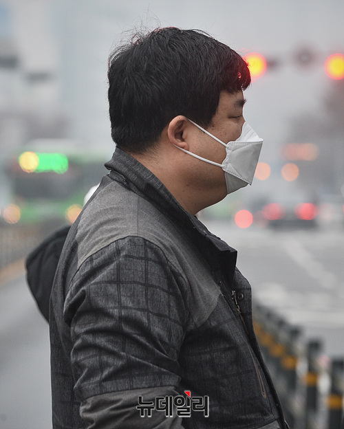 미세먼지 비상저감조치가 시행된 11일 오전 서울 동작구에서 시민들이 마스크를 착용하고 출근하고 있다. 중국발 스모그의 영향으로 이날 오전 동작구의 미세먼지 농도는 '매우 나쁨(151㎍ 이상)' 단계를 나타냈다.