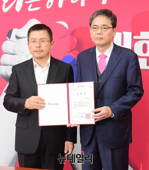 유재수 감찰농단 진상조사특별위원회 위원장으로 임명된 곽상도 자유한국당 의원이 11일 오전 국회에서 열린 문 정권 국정농단 3대 게이트 진상조사특위 임명장 수여식에서 황교안 대표로 부터 임명장을 받고 있다.
